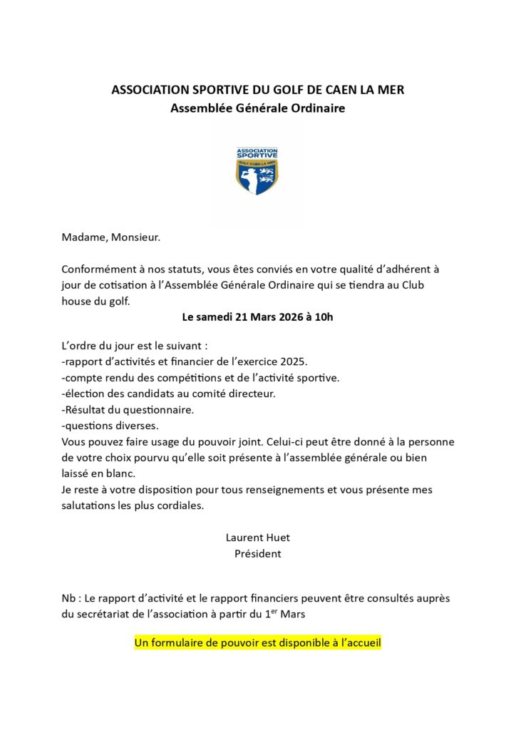L’Association Sportive vous invite à son Assemblée Générale qui aura lieu le samedi 21 mars 2026 au Golf de Caen la Mer.