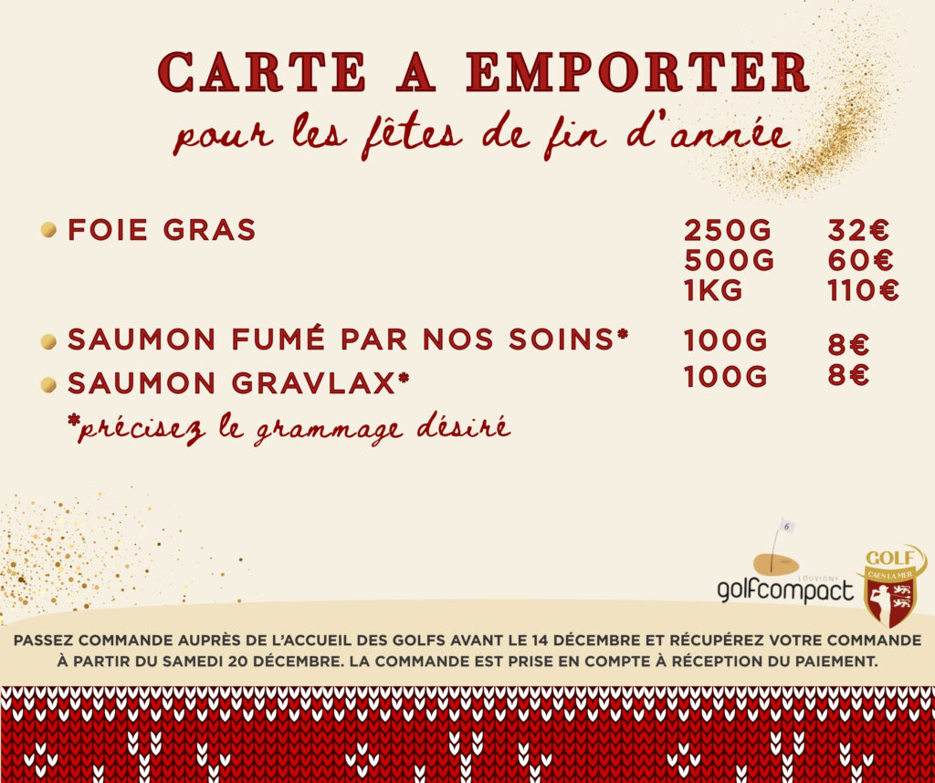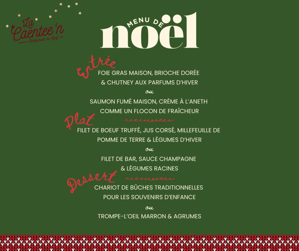 Tout au long de l’année, le club house est un lieu de partage. Pour Noël, nous souhaitons prolonger cette convivialité autour d’un menu* spécial, servi en 3 temps. Il sera proposé le jeudi 18 et le vendredi 19 décembre midi. Réservez votre table dès maintenant à l’accueil du golf ou bien par téléphone.