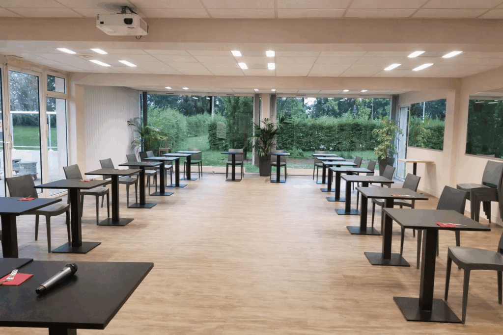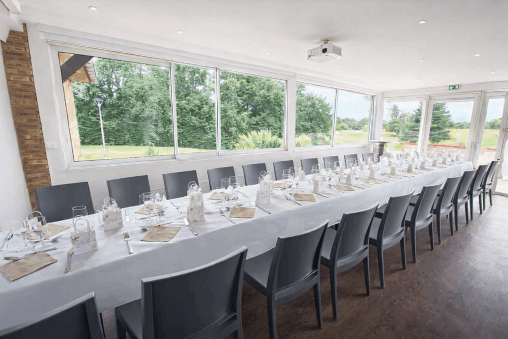 Spacieuse et lumineuse, la Salle Angot peut accueillir jusqu’à 100 personnes, selon la disposition choisie (théâtre, U, classe, cocktail…). Elle offre une vue dégagée sur le parcours de golf grâce à ses grandes baies vitrées, créant une atmosphère à la fois professionnelle et apaisante.